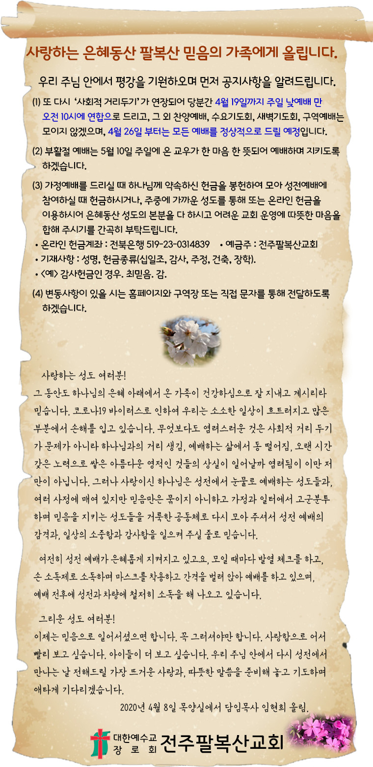 | 이전글 | 우리 주 예수 그리스도의 이름으로 사랑하는 성도들께 문안드립니다. | 김훈 | 2020.04.24 | 0 | 1653 |